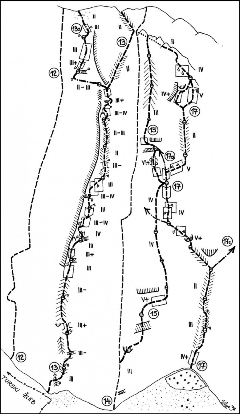 Precka v desno v petem cugu. Ko se po precki usmerimo navzgor vidimo nekaj klinov in vec moznosti. Jaz sem se odlocil za precj tezko opcijo cez  Skica iz slovenskih sten (17 igliceva)
