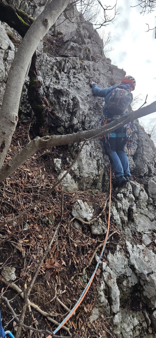 Težavnost smeri ni bila v oceni kot taki, ampak v krušljivosti. 5. dolžino smeri res odsvetujem. Vsa sidrišča smo delali na drevesa. |