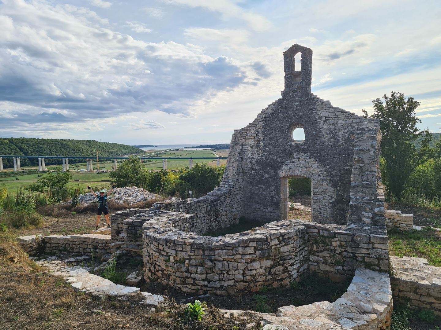 Nova Vas, ostanki trdnjave in Cerkve sv. Jurija (omemba 992), spodaj Antenal in dolina reke Mirne