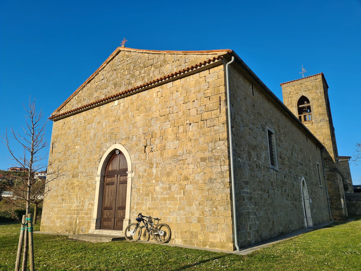 Koštabona (255 m), Cerkev sv. Kozme in Damijana (zgr. ok. 1446, barokizirana v 17. stol.)
