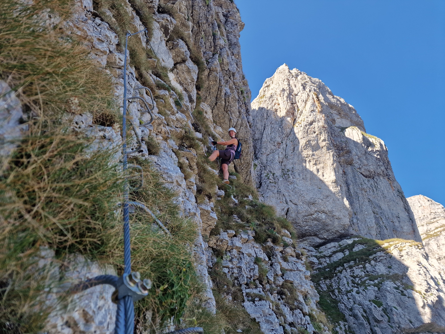 Komentar Najnovejša ferata v BiH je šolsko opremljena in manj zahtevna. Dolga je 830 m in visoka 200 m. Dober opis se najde na https://viaferrata.ba/ferrate/via-ferrata-kuk-volujak/. Časi so nekoliko napihnjeni (dostop 1.20h, vzpon 2h, sestop 1h), saj je nama ob ne prevelikem hitenju vse skupaj vzelo nekaj čez 3.30h. Turo sva si izbrala kot dodatek k vzponu na bližnji Maglić. S Prijevora (glej opis ture na Maglić) sva se odpeljala na kosilo v Tjentište, potem pa spet navzgor skozi vas Čemerno na neskončne livade pod Volujkom, Biočem, Lebršnikom in najinim precej nižjim, a strmim osamelcem Kukom. Prespala sva v avtu v bližini tisti dan zaprtega planinskega doma Papin do (1457 m). V bližini sta v avtu prenočila še dva Zagrebčana, namenjena na črnogorski Bioč, drugače pa vse prostranstvo brez drugih duš. Sam vzpon in tudi sestop sta uživaška. Istega dne sva se še pred mrakom uspela vrniti na Hvar.