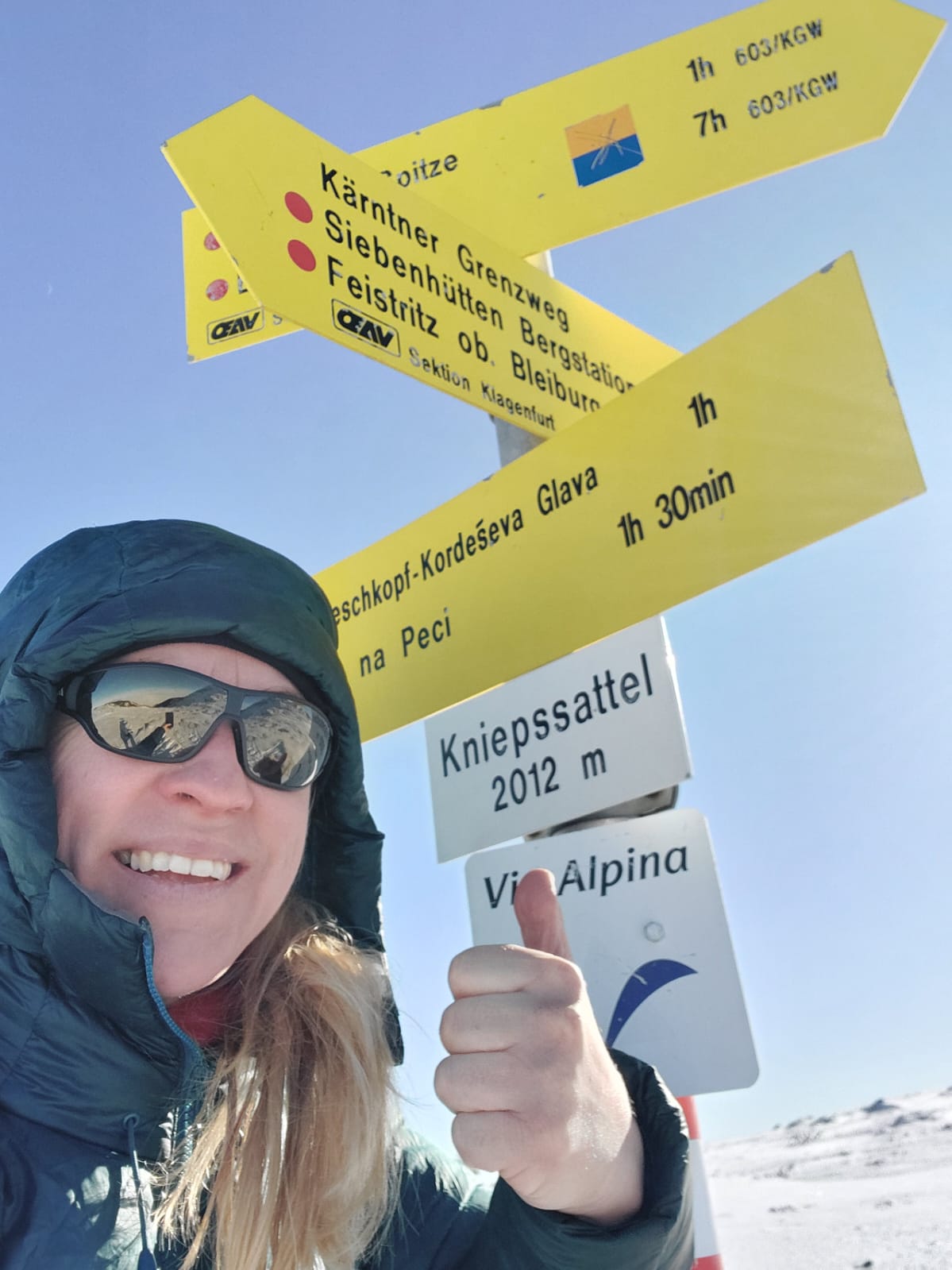 | Komentar Štartala sem pozno, ker sem zjutraj še mogla Branča in Bibo zbudit, kar pa ni direktno povezano s tem turnim smukom ;) Na štartu sem srečala 3 slovenjgradčane, ki so mi povedali kje se karta kupi (10evrov) in smo se potem kar skoz malo skupaj malo oni naprej malo jaz naprej izmenjavali, vmes malo zgubili in spet srečali na kocu zadnjega vzpona na smučišču. Jaz sem potem šla še do sedla, oni na pivo in so me spet dohiteli na spustu. Na parkirišču pa smo družno spili pivo, ki so ga prinesli iz Jahorine, jaz pa njim Hajdinski štrudl. Fajna tura, čeprav je vmesni del bil zelo poledenel in me je na vzponu ene 3x pošteno vrglo in se se komaj pobrala. Od konca smučišča do sedla pa dobre snežne razmere, če ne bi bila tako pozna in zmantrana bi šla še na vrh, ampak tako pač je včasih zmanjka za vrh... Ja, glede na pomanjkanje snega je bila to optimalna opcija na relaciji Hajdina - Celovec. |