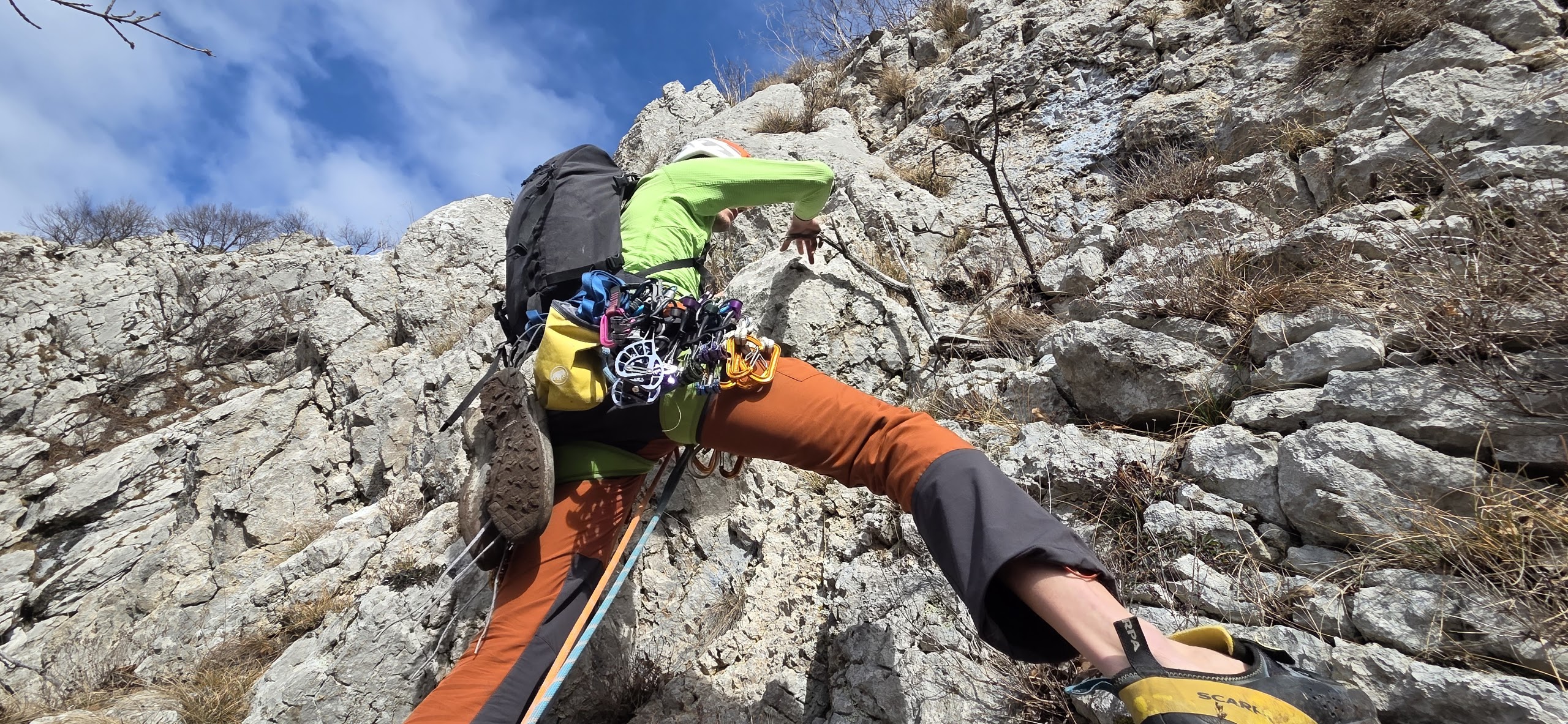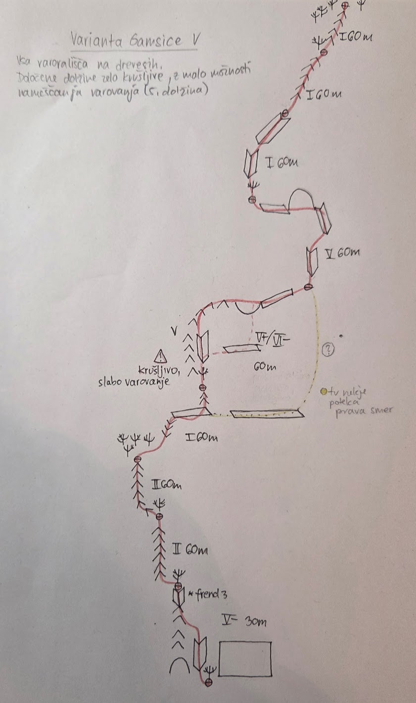Težavnost smeri ni bila v oceni kot taki, ampak v krušljivosti. 5. dolžino smeri res odsvetujem. Vsa sidrišča smo delali na drevesa. |