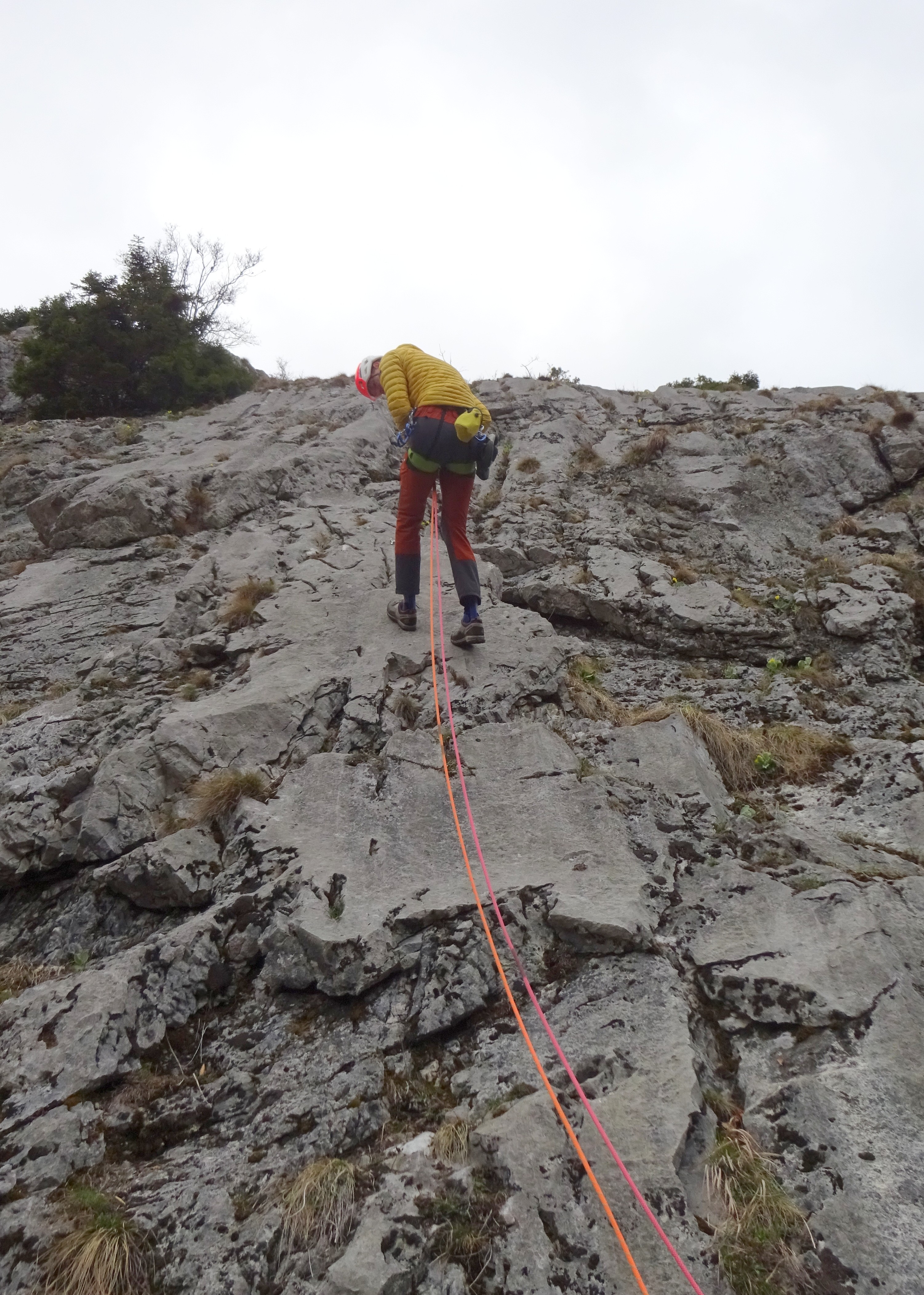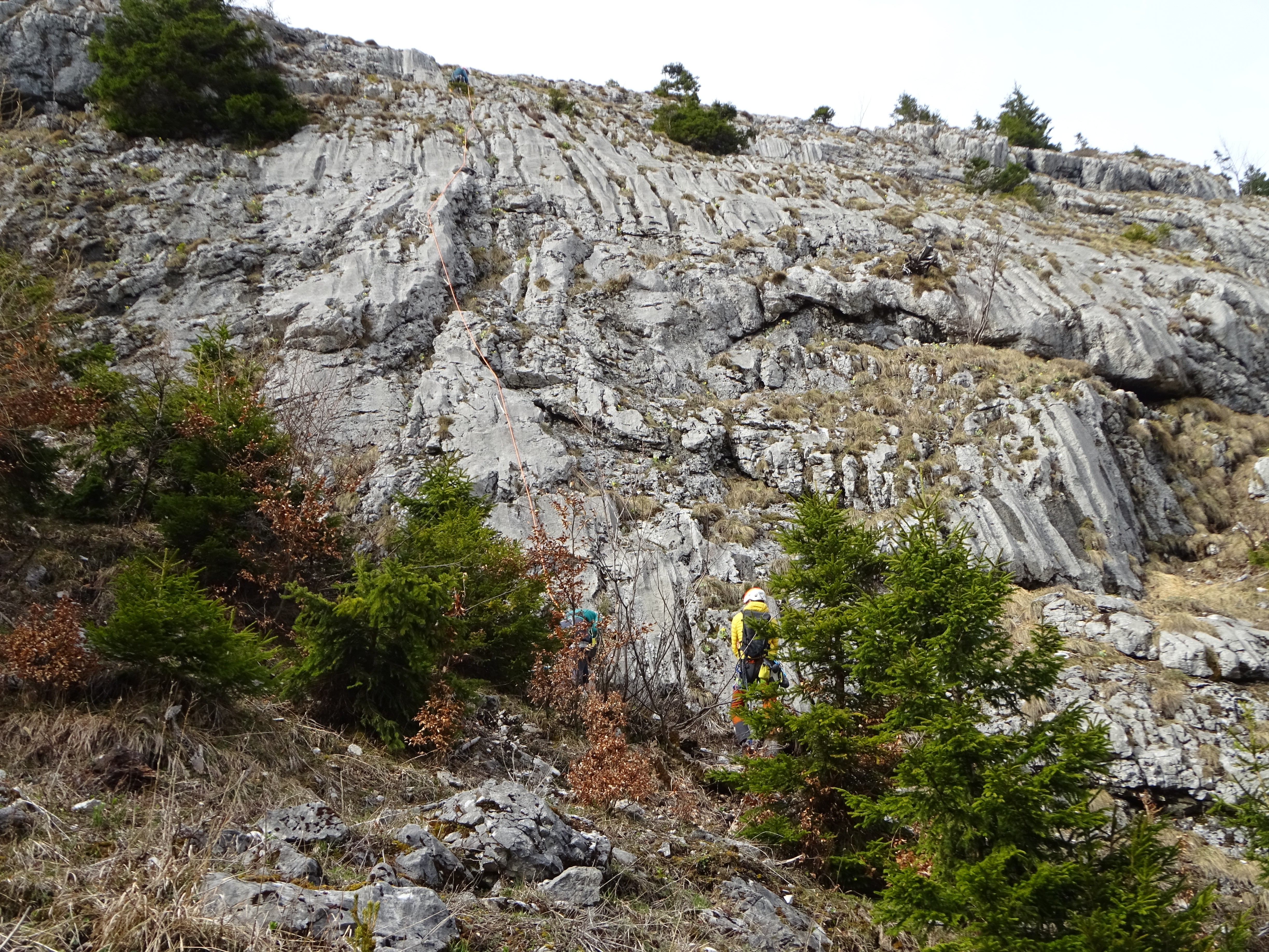 Letos smo vstop v smer hitro našli. Nekoliko smo bili (neprijetno) presenečeni glede opremljenosti smeri, ker razen svedrovca 5 metrov nad vstopom, ni bilo videti ničesar. Kasneje se je izkazalo, da so v smeri stare zelo tanke zanke, ki v primeru padca itak nič ne držijo. Po 60 metrih plezanja smo našli zgledno sidrišče iz dveh svedrovcev in rinke za spust ob vrvi. V drugem raztežaju po 60 metrih podobno sidrišče. Tukaj smo z vzponom končali, ker se dalje stena položi in smo pričeli z abzajlom. Smer je čisto O.K. s solidno skalo, le vmesno varovanje bi bilo potrebno urediti. Vsekakor pa se smer ne more primerjati po lepoti s tistimi tremi ki so opisane v Bersteigen.com.